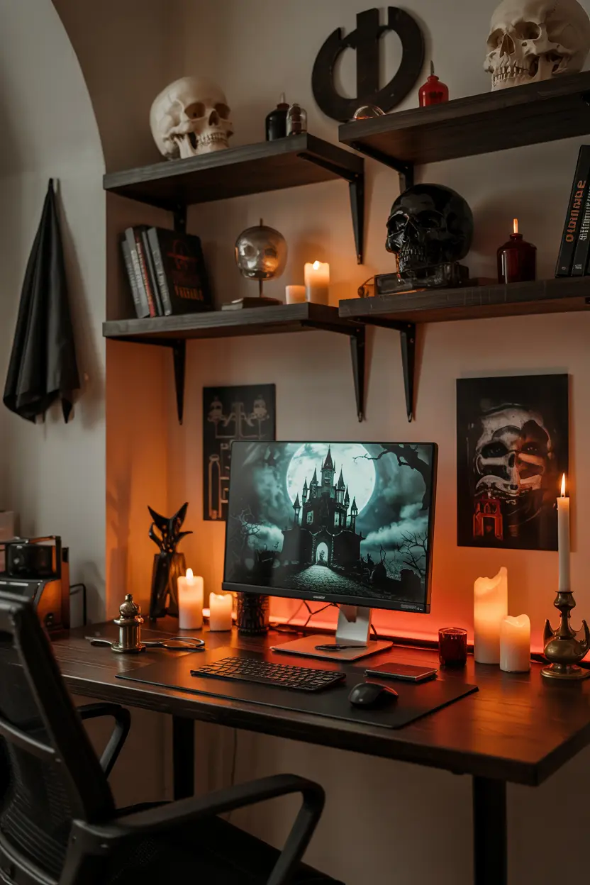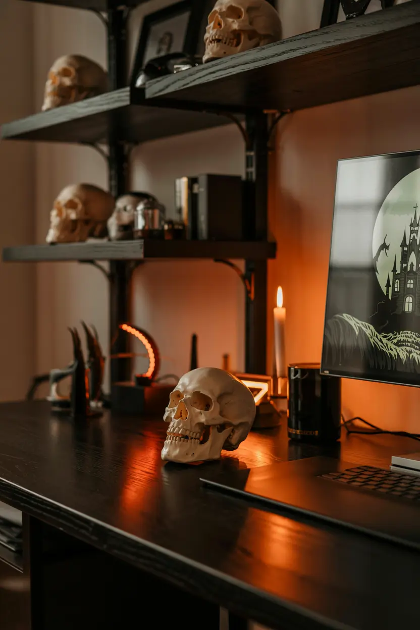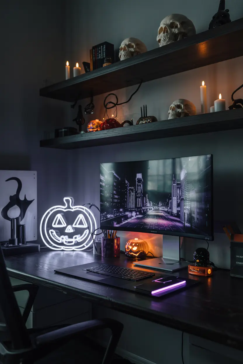 - Lighting is everything: Ditch the overhead light. A simple orange LED strip behind your desk can instantly create that Halloween mood.