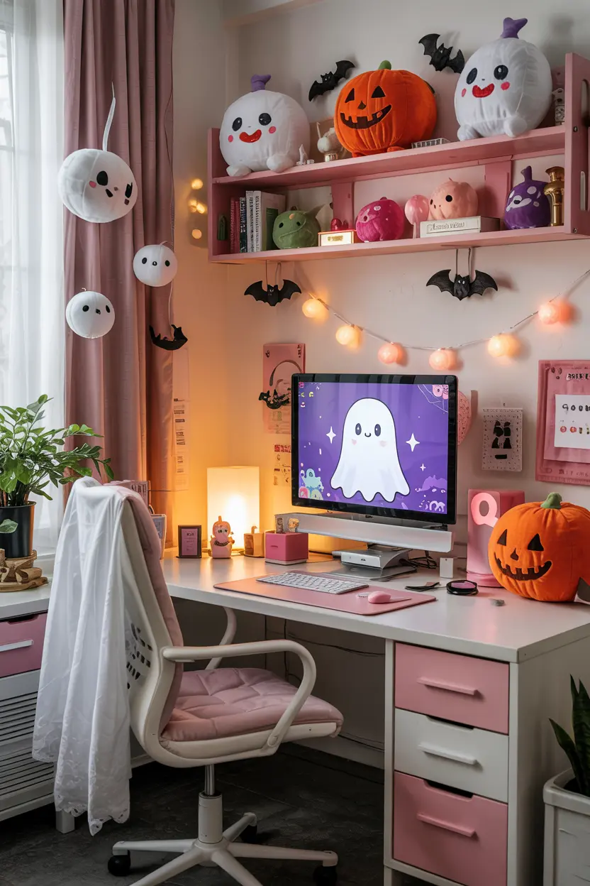- Theme consistency: Every element from shelf plushies to desk accessories follows the pastel Halloween concept