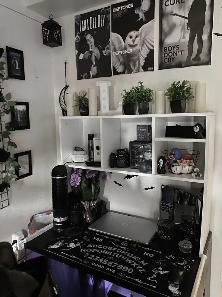 This setup immediately captures my heart as the perfect blend of macabre elegance and personal nostalgia. The combination of moody music posters (The Cure, Deftones, Lana Del Rey) with mystical elements creates a deeply personal space that feels both curated and authentic. The monochrome foundation with strategic purple lighting makes every decorative element pop while maintaining a cohesive, sophisticated atmosphere.