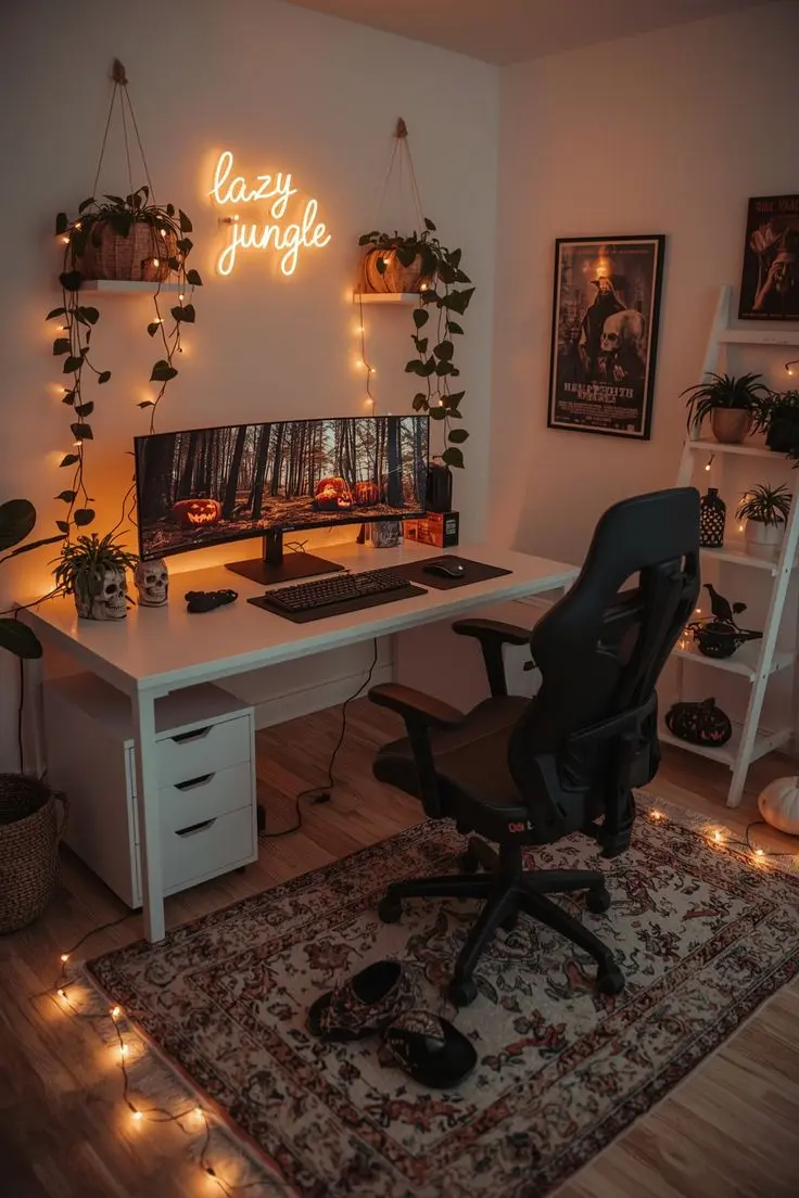 This setup masterfully blends natural elements with Halloween vibes to create what feels like a peaceful autumn retreat rather than a stereotypical spooky space. The “lazy jungle” neon sign perfectly captures the room’s essence—it’s a place to unwind amidst seasonal decor. The ultrawide curved monitor with its immersive pumpkin forest wallpaper acts as a digital window that extends the physical space’s theme beautifully.
