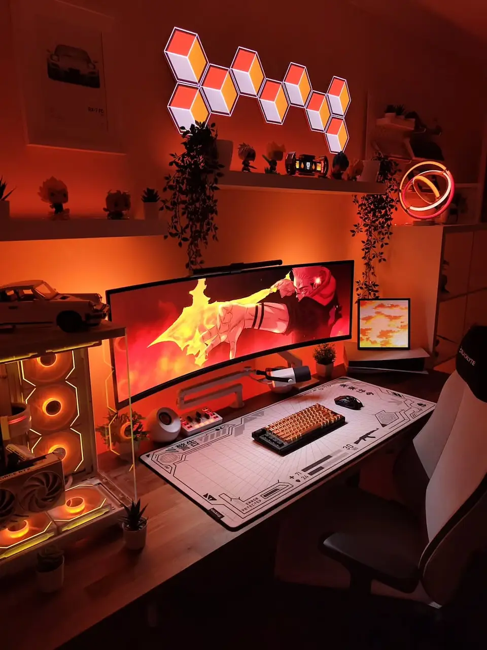 The hidden brilliance here is the strategic lighting layers—from the geometric wall panels to the PC’s RGB fans and desk lamp, every light source contributes to the orange glow without feeling overwhelming. For even more depth, add nanoleaf hexagons in warm tones to expand the ceiling pattern.