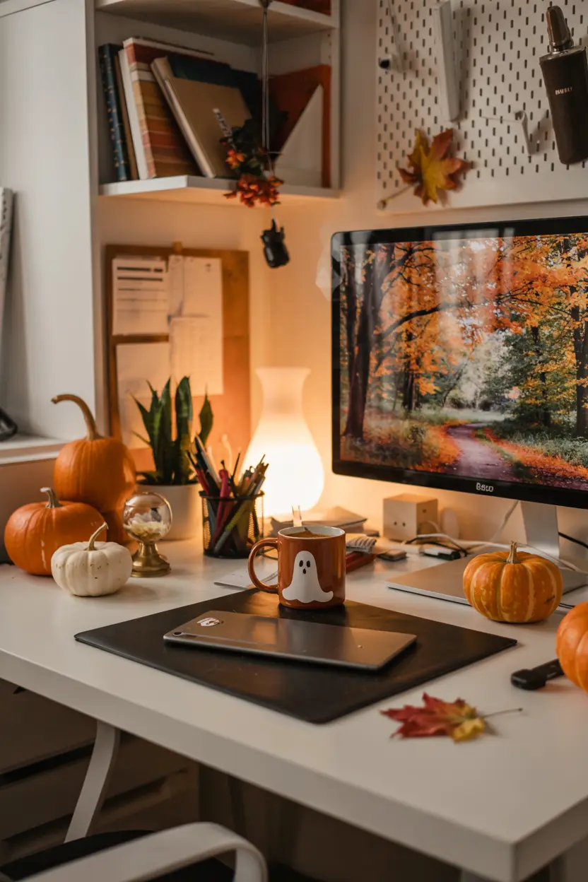 - Minimalist foundation: The clean white desk and pegboard with autumn leaves keep the look organized yet festive, proving that less is often more.